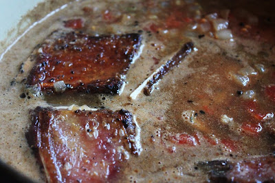 Add the wine and the stock and bring the mixture to a boil. Return the short ribs to the pot. Cover and place in the oven for 2 1/2 hours until the meat is fork-tender and falls easily from the bone.