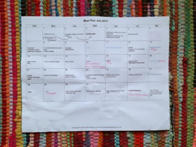 i don't like repeating recipes so at the end of every month, i sit down and think out new recipes/ideas to change old recipes and fill in the days on a blank calendar. i fill in when mike is going to be late (maybe a meat-free meal for the boys and i) or when we have a church function, date, or etc.